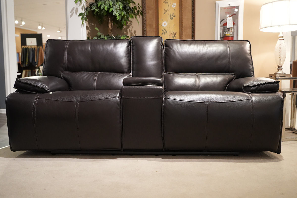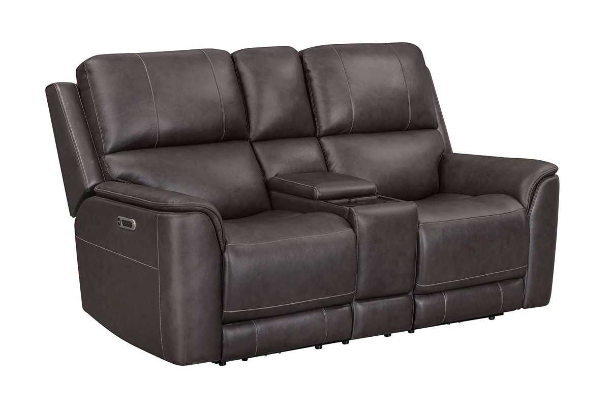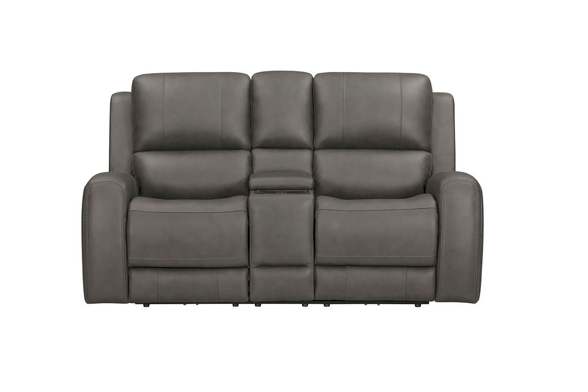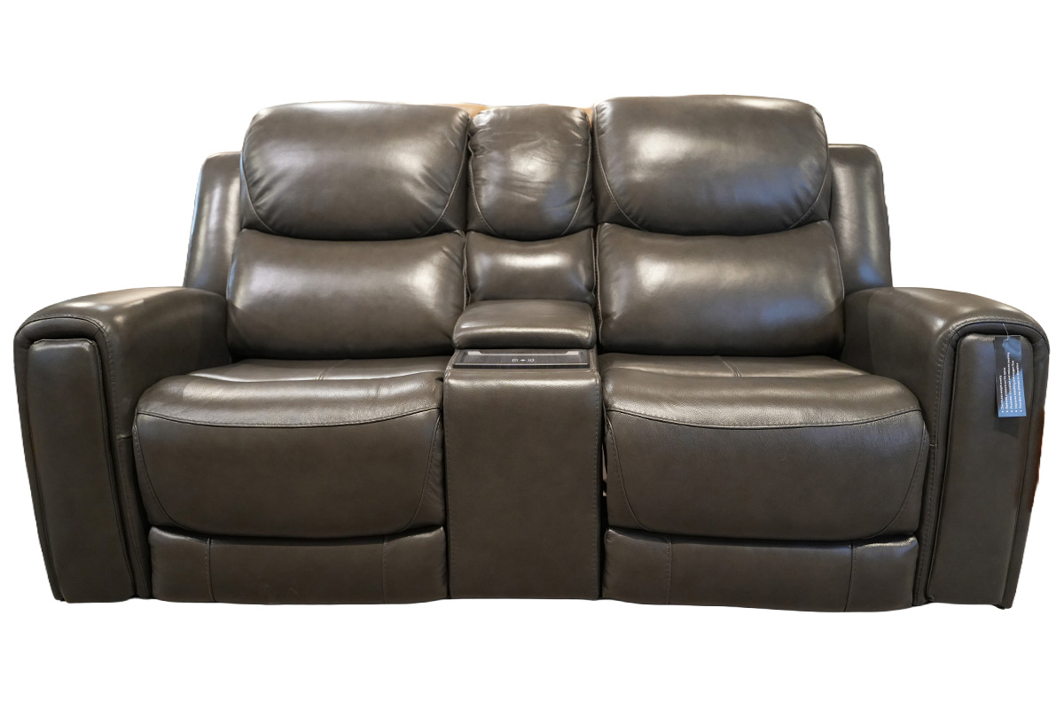 P2 POWER RECLINING CONSOLE LOVESEAT IN LEATHER/LV L1642 COLOR ALPHA GREY WITH ZERO GRAVITY AND HIDDEN ARM CUP HOLDER MATCHING STITCHING POWER HEADRESTSee Details