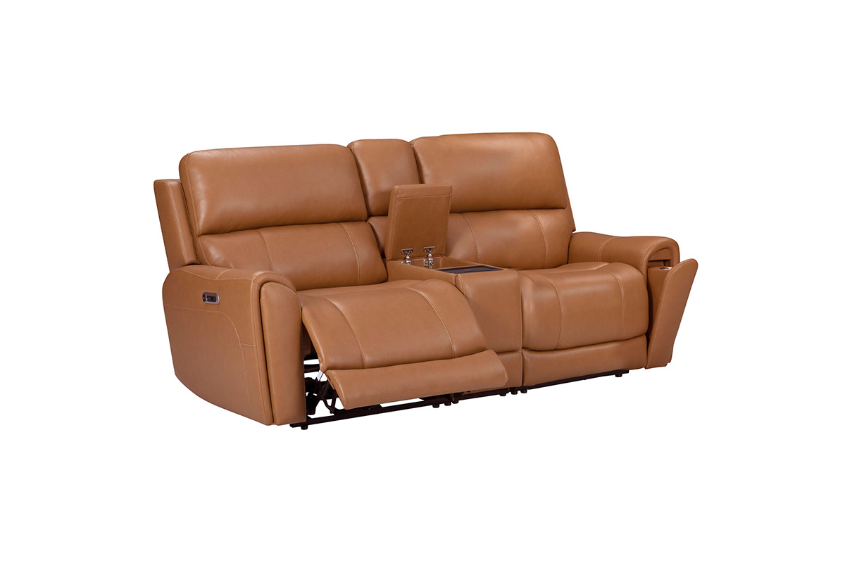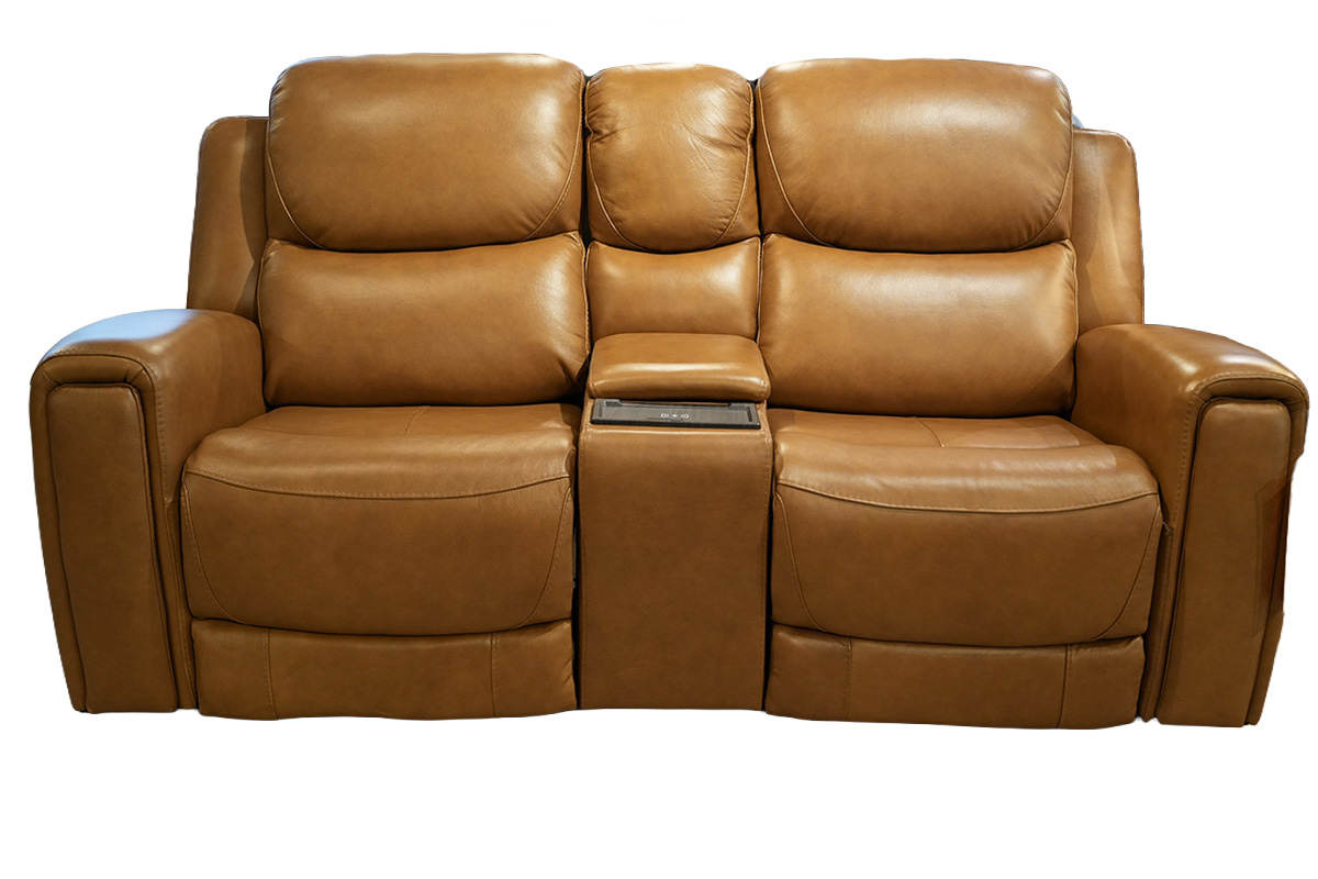 P2 POWER RECLINING CONSOLE LOVESEAT IN LEATHER/LV U243082 COLOR BOSTON CAMEL WITH ZERO GRAVITY AND HIDDEN ARM CUP HOLDER MATCHING STITCHING POWER HEADRESTSee Details