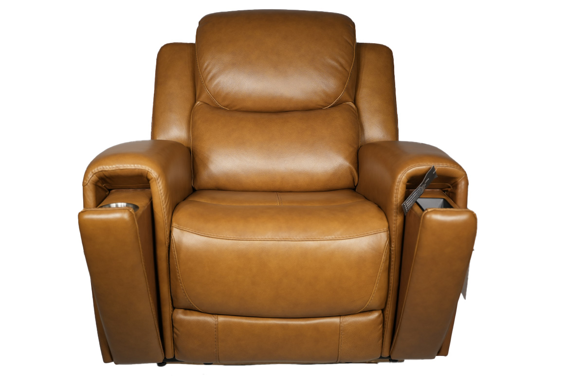 P2 POWER RECLINER IN LEATHER/LV U243082 COLOR BOSTON CAMEL WITH ZERO GRAVITY AND HIDDEN ARM CUP HOLDER MATCHING STITCHING POWER HEADREST & WIRELESS CHARGERSee Details