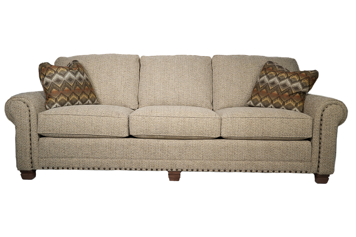 393 LARGE SOFA IN COVER 508004 GRD 11 PILLOWS IN UPGRADED COVER 372503 GRD S65. DOWN PILLOW INSERTS. ANTIQUE MAPLE FINISH RUBBED BRONZE NAILSSee Details