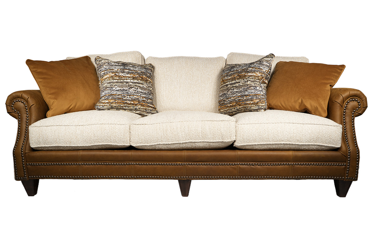 SOFA IN LEATHER/FABRIC ELDON SAND/ DIXIELAND PECAN LEATHER LONGHORN LIGHT (HOH) LPP STREEP HAZELNUT SPP JOOP ONYX ADD DOWN SEAT CUSHIONS NAILS: ANTIQUE STRAIGHT LEGS WITH ESPRESSO FINISHSee Details
