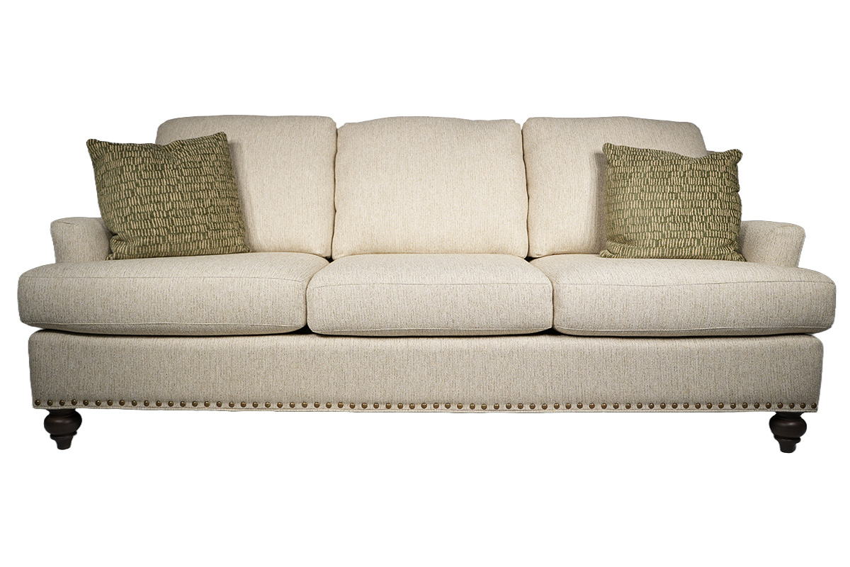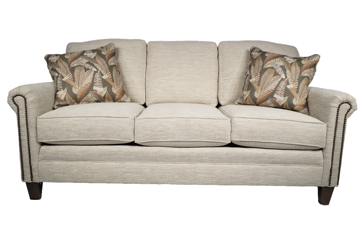 SOFA IN FABRIC: 546201 GR 10 WOOD LEG FINISH: SHAGBARK NAILS: RB PILLOW FABRIC 541508 GR 35 (PROMO HANDLE)See Details