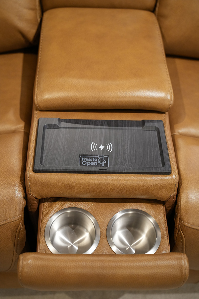 P2 POWER RECLINING CONSOLE LOVESEAT IN LEATHER/LV U243082 COLOR BOSTON CAMEL WITH ZERO GRAVITY AND HIDDEN ARM CUP HOLDER MATCHING STITCHING POWER HEADREST