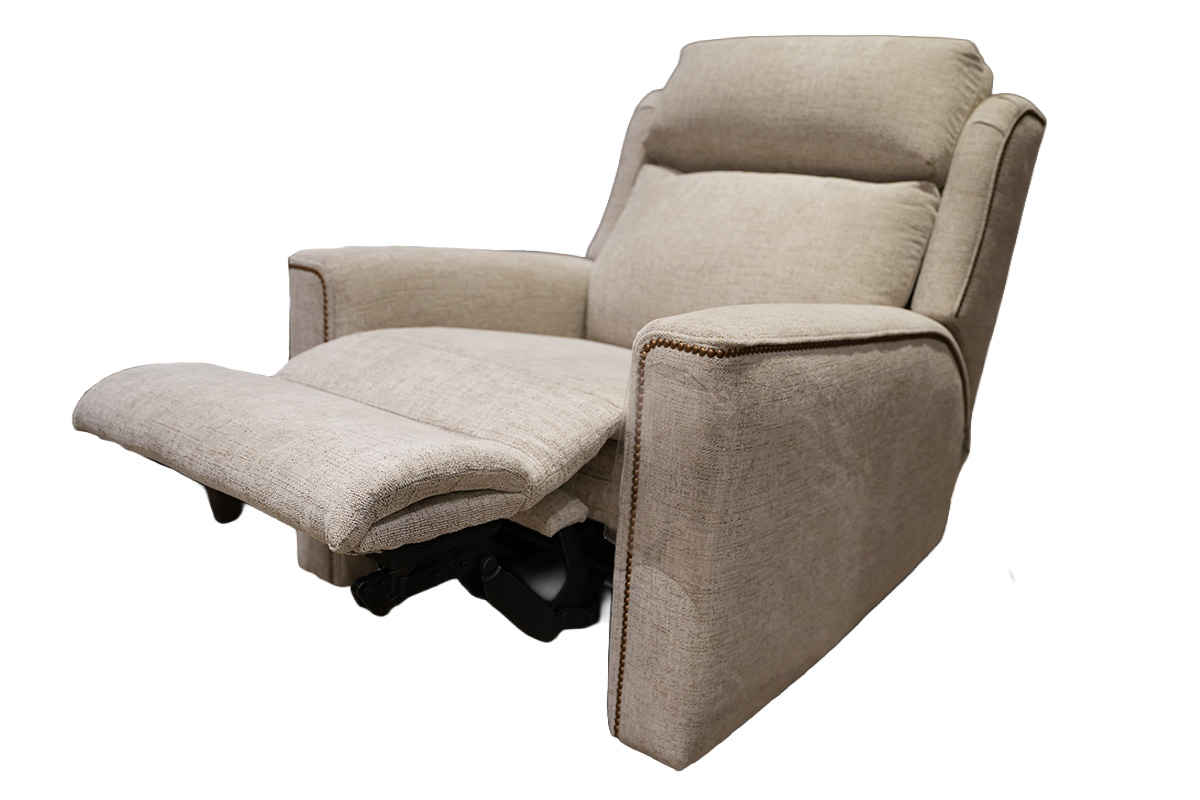 POWER RECLINER WITH POWER HEADREST IN FABRIC 502302 GRADE 11 WITH NAILHEAD TRIM: AB ANTIQUE BRASS